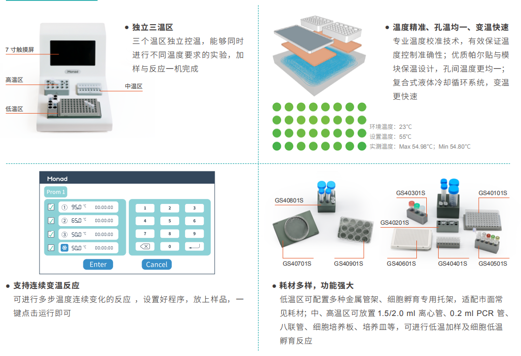 NaCha Pro多溫區(qū)工作臺,是NaCha多溫區(qū)工作臺的升級版,同樣擁有三個獨立溫區(qū),點擊屏幕即可輕松設置各溫區(qū)的反應溫度和時間,推薦用于低溫加樣及中、高溫的溫育反應。優(yōu)質的帕爾貼與精準的溫度校準技術,配合復合式液體冷卻循環(huán)系統(tǒng),有效保證溫度控制準確性與孔間溫度均一性,實現(xiàn)快速變溫。NaCha Pro 擁有更寬廣的溫度范圍,中溫區(qū)可進行連續(xù)變溫,多步反應一臺機器即可完成。同時增加了高溫區(qū) 1.5/2.0 ml 孔的通量,支持多個樣本高溫變性及孵育反應。低溫區(qū)可搭配各類金屬管架,進行低溫加樣及細胞低溫孵育反應,全方位多功能支持您的實驗,獲得穩(wěn)定準確的結果。