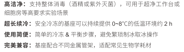 恒溫金屬冰盒,由底部基座和上部金屬管架兩部分組成,完全冷凍的基座可持續(xù)提供0~8℃低溫環(huán)境約2小時,確保加樣過程中樣品和試劑的活性,有效提高實驗可靠性和工作效率?;闹黧w為鋁材,內(nèi)部填充環(huán)保水基變相材料,外層硅膠套具有保護(hù)基座與保溫雙重效果?;鶐в袦囟扔?,具有溫度指示功能,當(dāng)溫度計指針指示在0℃左右時,表明基座進(jìn)入溫度穩(wěn)定期。此外,恒溫金屬冰盒配套有毛巾,方便吸附冷凝水。