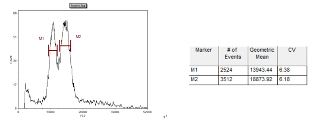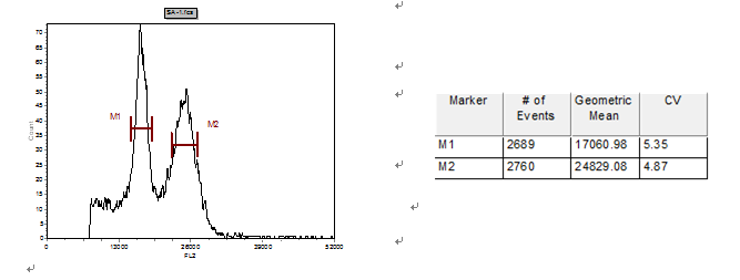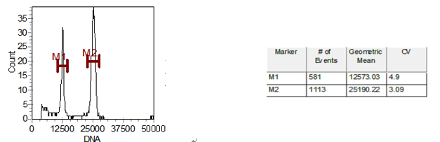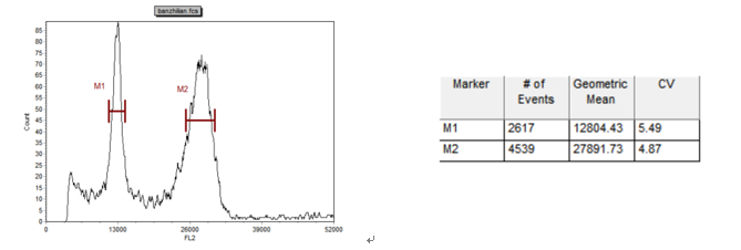 首先需要裂解液將組織中細胞核釋放出來,并打開DNA鏈,然后用PI染液將細胞核DNA染色,再用儀器檢測細胞核里被染色的DNA發(fā)出的熒光強度。結(jié)果的橫坐標(biāo)表示熒光強度,縱坐標(biāo)表示細胞數(shù)量,通常來說,信號峰高說明信號比較好,雜質(zhì)少。